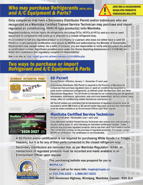 Seuls les techniciens certifiés qui détiennent une carte de certification valide peuvent acheter des réfrigérants et des pièces réglementés ainsi que des entreprises au Manitoba qui détiennent un permis de distributeur secondaire. Les grossistes et toute personne vendant des produits réglementés doivent voir/enregistrer le numéro de certification ou le numéro de permis SD de chaque article réglementé qu'ils vendent. Les pénalités pour ne pas le faire peuvent aller jusqu'à $500 000 pour une première infraction.